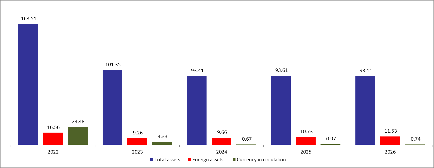BDL Total Assets, Foreign Reserve Assets and Currency in Circulation by End of March 2026 ($B):