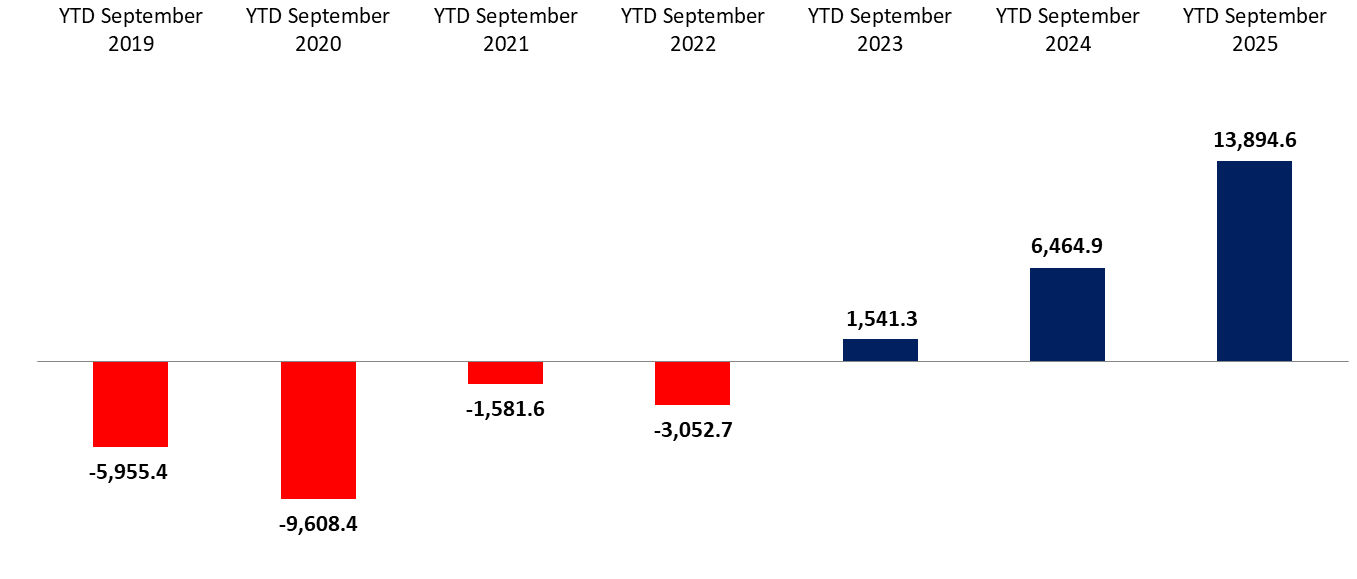 Cumulative Balance of Payments Surplus as Change of NFA at $13,894.6M by September 2025, Compared to a Surplus of $6,464.9M by September 2024