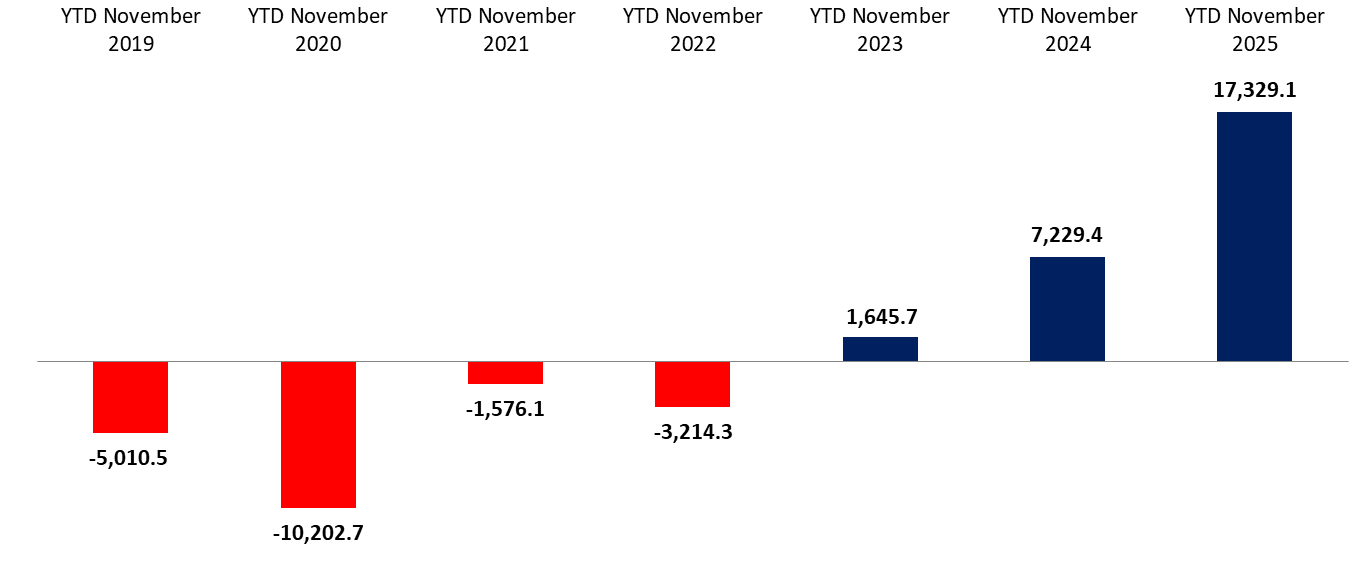 Cumulative Balance of Payments Surplus as Change of NFA at $17,329.1M by November 2025, Compared to a Surplus of $7,229.4M by November 2024