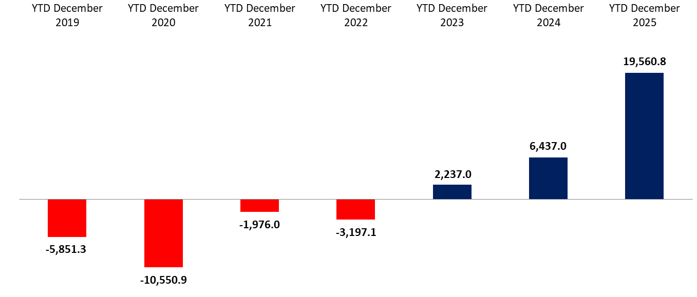 Cumulative Balance of Payments Surplus as Change of NFA at $19,560.8M by December 2025, Compared to a Surplus of $6,437.0M by December 2024