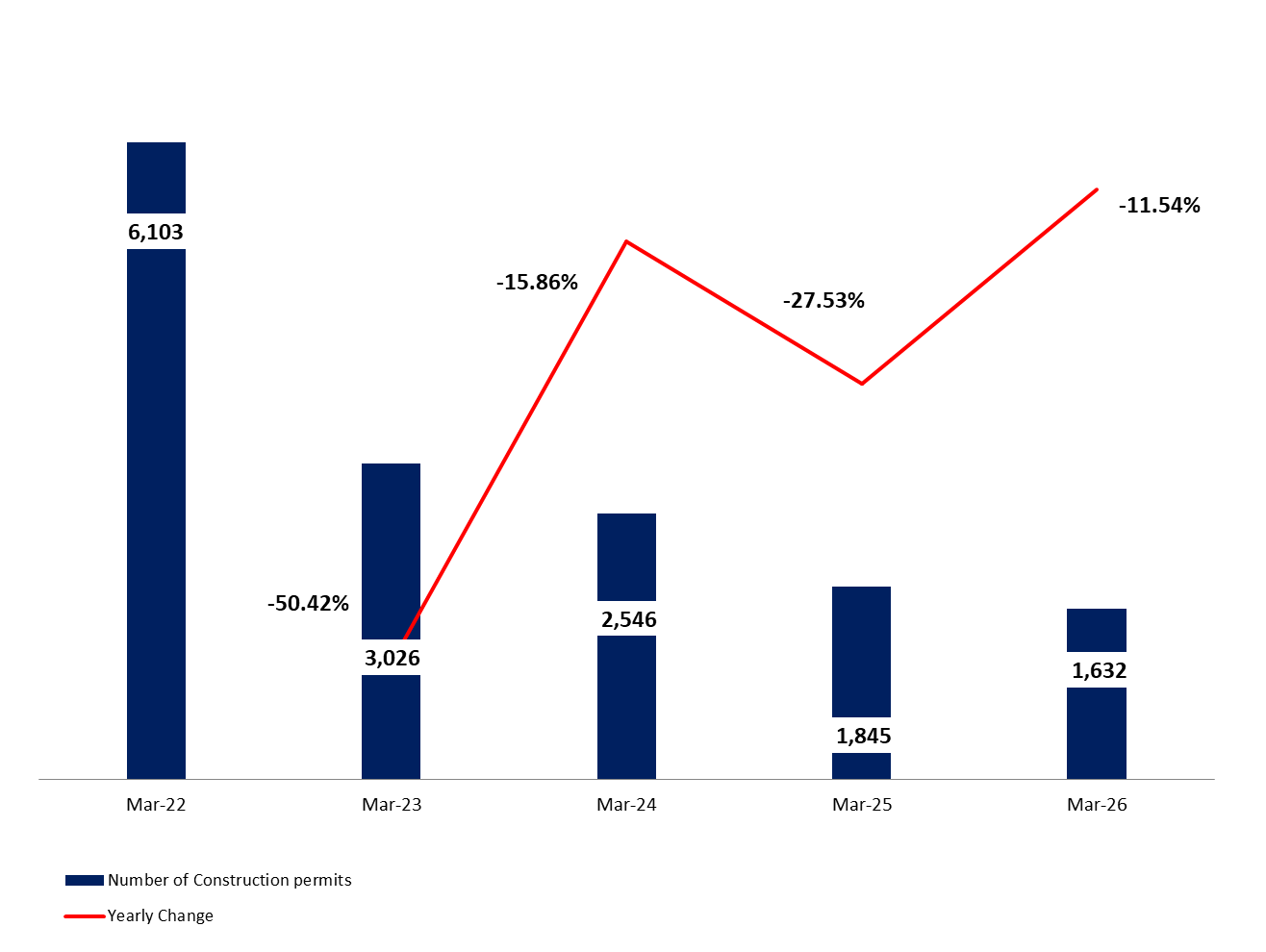 Cumulative Construction Permits Fell Yearly by 11.54% to 1,632 by March 2026