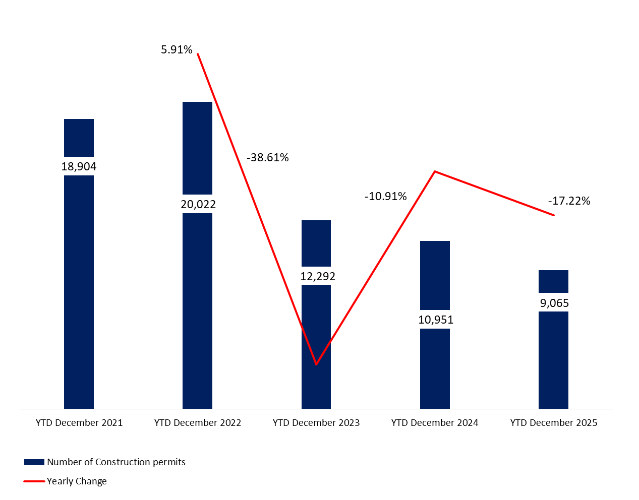 Cumulative Construction Permits Fell Yearly by 17.22% to 8,324 by December 2025
