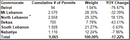 Moreover, construction activity declined across all governorates compared to the previous year except for North Lebanon, with the steepest fall in Beirut (-76.67%) followed by Bekaa (-43.51%) and Mt. Lebanon (-32.39%). The table below provides a detailed breakdown by governorate: