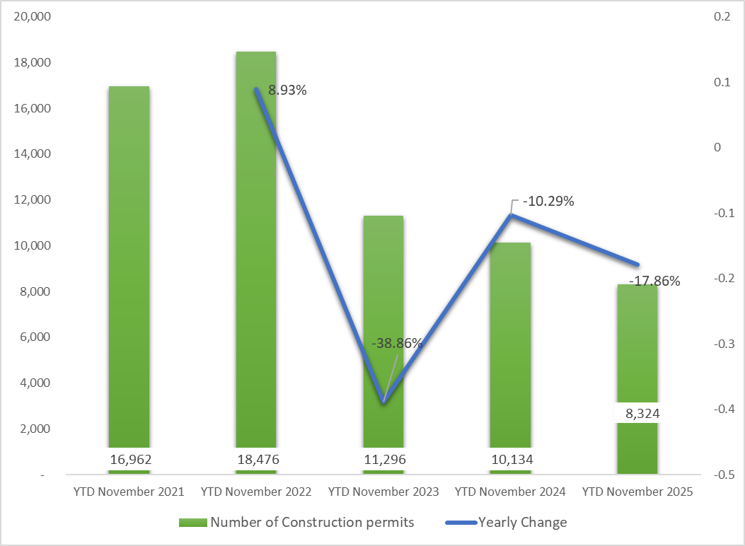 Cumulative Construction Permits Fell Yearly by 17.86% to 8,324 by November 2025