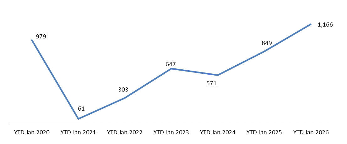 Year to Date (YTD) Growth of Registered Passenger Cars in January (2020-2026)