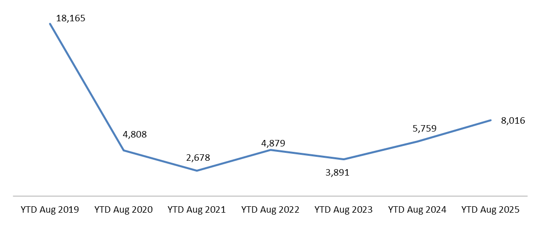 Year to Date (YTD) Growth of Registered Passenger Cars up to August (2019-2025)