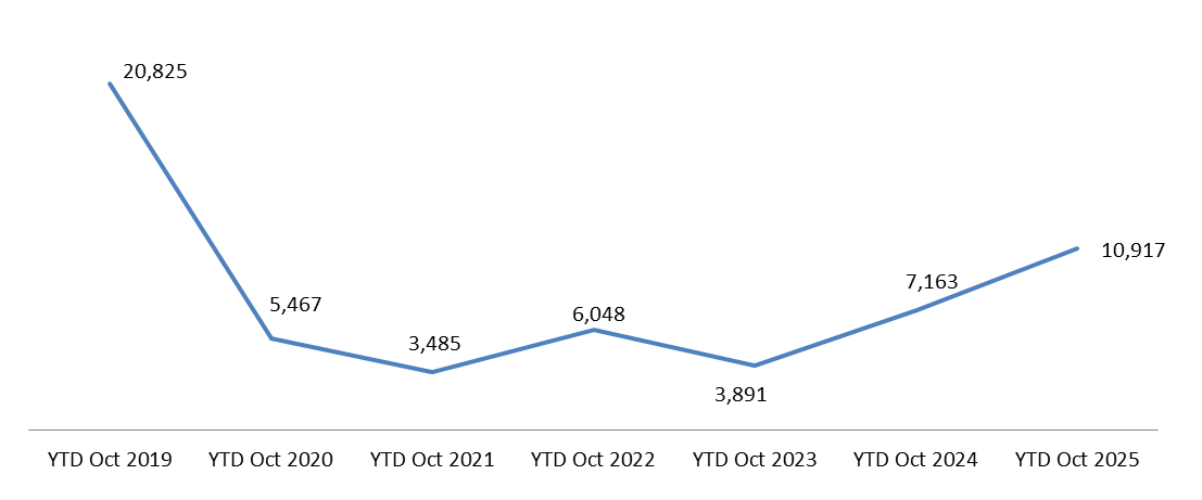 Year to Date (YTD) Growth of Registered Passenger Cars up to October (2019-2025)