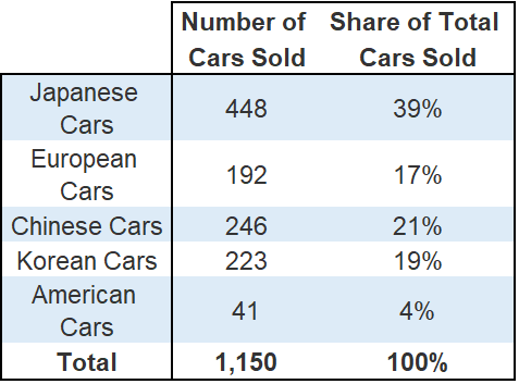 On a monthly basis, 1,150 cars were sold in November 2025. The distribution of cars was as follows: