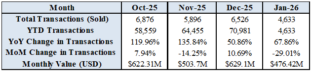 Cumulative Real Estate Transactions Hit $476.42M in January 2026