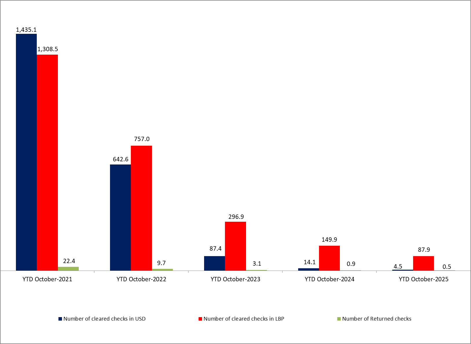 Moreover, the volumes of cleared checks in Lebanese Pounds and foreign currencies witnessed substantial yearly drop of 41.32% and 68.41% respectively to settle at 87,941 and 4,452 checks, by October 2025. Accordingly, the dollarization rate of checks in terms of volume fell from 8.59% in October 2024 to 4.82% in October 2025.