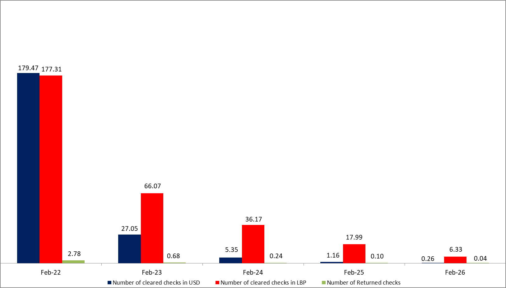 Moreover, the volumes of cleared checks in Lebanese Pounds and foreign currencies witnessed substantial yearly drop of 64.80% and 77.59% respectively to settle at 6,331 and 260 checks, in February 2026. Accordingly, the dollarization rate of checks in terms of volume fell from 6.06% in February 2025 to 3.94% in February 2026.