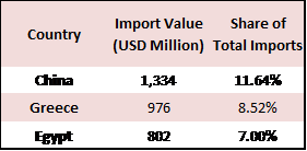 The top three import destinations in 2025 up till July were China, Greece, and Egypt, accounting for 11.64%, 8.52%, and 7.00% of the total value of imports, respectively. The top imported products were mineral products (24.56%) at $2,814 million, pearls, precious stones, and metals (15.28%) at $1,751 million, and products of the chemical or allied industries (8.31%) at $952 million.