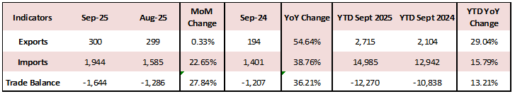 According to the Lebanese Customs Administration, Lebanon’s cumulative trade deficit increased by 13.21% year-over-year (YoY), to reach $12.3B by September 2025. This change was driven by a cumulative 15.79% YoY ($14,985 million) surge in imports by September 2025 despite a 29.04% YoY ($2,715 million) rise in exports during the same period.