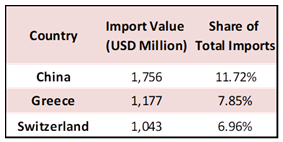 The top three import destinations in 2025 up till September were China, Greece, and Switzerland, accounting for 11.72%, 7.85%, and 6.96% of the total value of imports, respectively. The top imported products were mineral products (24.83%) at $3,721 million, pearls, precious stones, and metals (15.16%) at $2,272 million, and products of the chemical or allied industries (8.29%) at $1,243 million.
