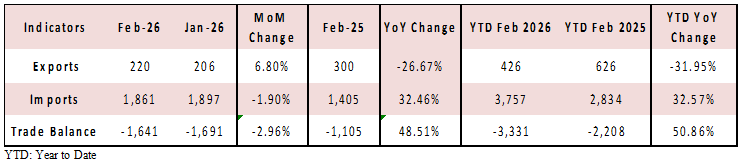 According to the Lebanese Customs Administration, Lebanon’s cumulative trade deficit increased by 50.86% year-over-year (YoY), to reach $3.33B by February 2026. This change was driven by a cumulative 32.57% YoY ($3,757 million) surge in imports by February 2026 and a 31.95% YoY ($426 million) fall in exports during the same period.