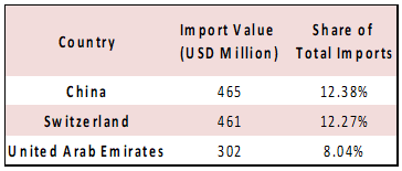 The top three import destinations by February 2026 were China, Switzerland, and United Arab Emirates accounting for 12.38%, 12.27%, and 8.04% of the total value of imports, respectively. The top imported products were Pearls, precious stones and metals (22.28%) at $837 million, Mineral products (21.29%) at $800 million, and Machinery; electrical instruments (9.29%) at $349 million.