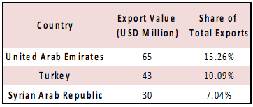 On the exports side, the top three destinations in 2025 were United Arab Emirates, Turkey, and Syrian Arab Republic capturing respective shares of 15.26%, 10.09% and 7.04% of the total value of exports. The top exported products were Pearls, precious stones and metals (19.95%) at $85 million, Base metals and articles of base metal (17.84%) at $76 million, and Prepared foodstuffs, beverages, tobacco (15.02%) at $64 million.
