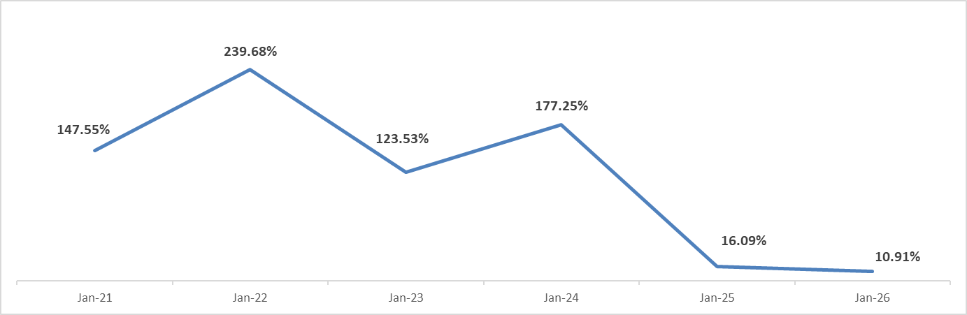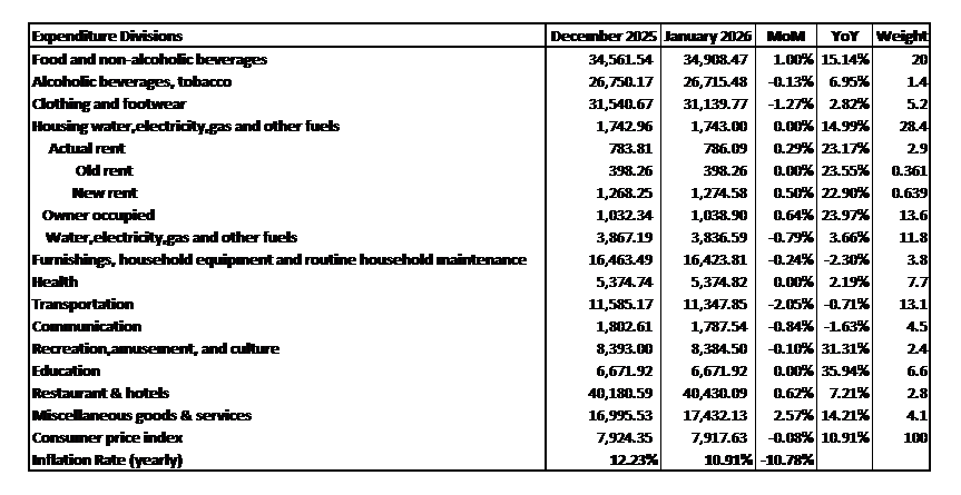 Lebanon’s annual inflation rate increased by 10.91% in January 2026, down from 12.23% in December 2025, according to the Central Administration of Statistics (CAS). The slowdown in inflation mainly reflected more stable price conditions during the month, supported by a steady exchange rate environment and easing pressures on import and transportation costs compared to previous months. In addition, overall consumer demand and spending stayed weak due to prolonged economic stagnation and weak purchasing power due to low income levels. This low demand restrains companies from increasing prices leading to an easing of annual inflation.