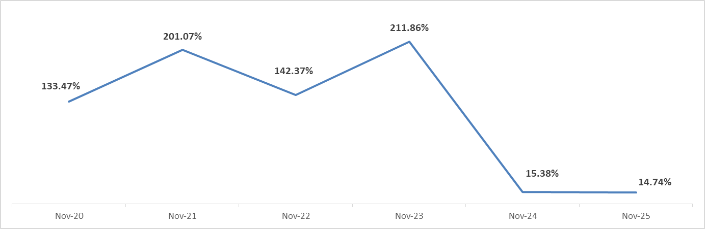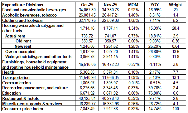 On a monthly basis, Consumer Price Index (Inflation) increased between October 2025 and November 2025 by 0.82%. It is also interesting to note that the average inflation rate, between the period of December 2024 and November 2025 stood at 15.09%.