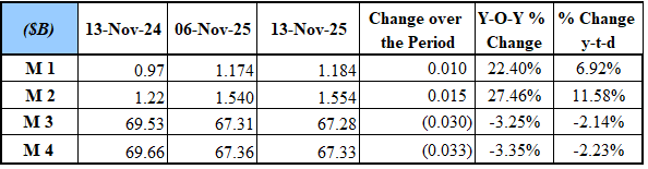 As such, the rate of broad money dollarization decreased from 98.25% in the week ending November 6th, 2025 to 97.7% in the week ending November 13th, 2025.