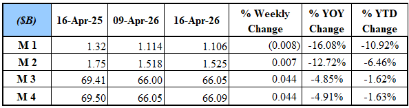 As such, the rate of broad money dollarization decreased slightly from 97.7% in the week ending April 9th, 2026 to 97.691% in the week ending April 16th, 2026.