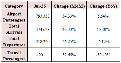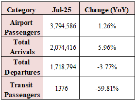 Number of Airport Passengers Up 1.26% Annually YTD by July 2025