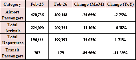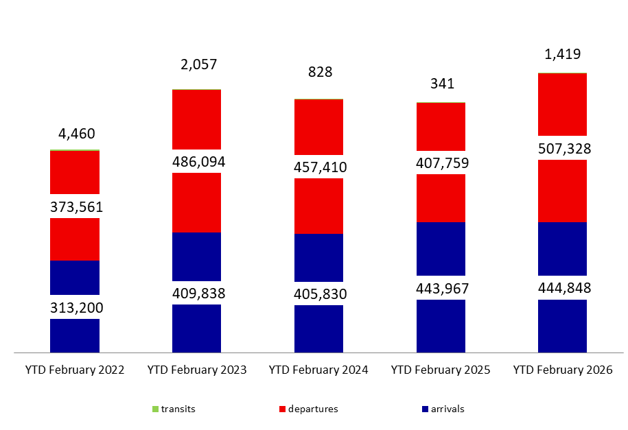 Airport activity declined on a monthly basis in February 2026, with total passengers falling to 409,148, down by 24.65% compared to January. This drop was mainly driven by a decrease in arrivals, which fell to 209,351, marking an 11.10% decline, alongside a sharper contraction in departures to 199,797, down by 35.03%. Transit passengers also decreased to 179, reflecting a significant monthly drop of 85.56%, also from a low base. On a yearly basis, total passengers fell by 2.75%, largely due to weaker arrivals, while departures recorded a slight increase. This overall softening in activity likely reflects seasonal effects following the holiday period, compounded by growing geopolitical tensions in the region that weighed on inbound travel and overall mobility.