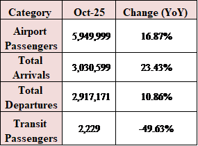 Number of Airport Passengers Up 16.87% Annually YTD by October 2025