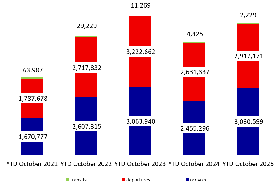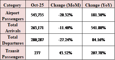 Monthly Arrivals increased by 541.80% YoY, and Departures grew by 84.16% YoY, underscoring the contrast between last year’s wartime flight suspensions and this year’s partial normalization of air operations. Transit passengers also rose 207.78% YoY, though from a very low base.