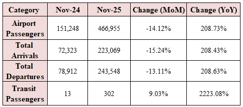 On a monthly basis, airport passengers’ activity reached 466,955 passengers in November 2025, down 14.12% MoM, reflecting the usual post-summer seasonal slowdown. However, on an annual basis, activity surged due to the extremely depressed travel levels recorded in November 2024 during the peak of the conflict. Monthly Arrivals increased by 208.43% YoY, and Departures grew by 208.63% YoY, underscoring the contrast between last year’s wartime flight suspensions and this year’s partial normalization of air operations. Transit passengers expanded dramatically by 2223.08% YoY, though from a very low base.